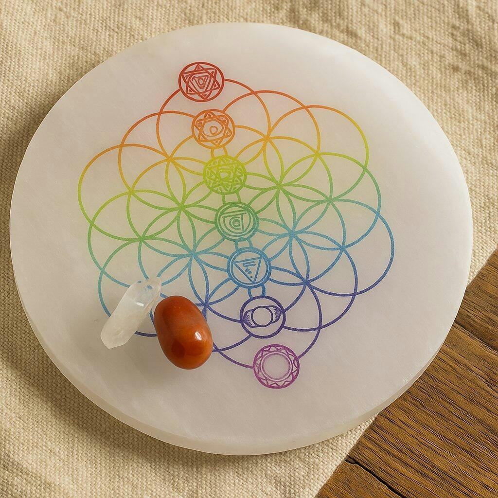 3-Inch Selenite Charging Plate — 7 Chakra Flower Alignment & Vastu Purification