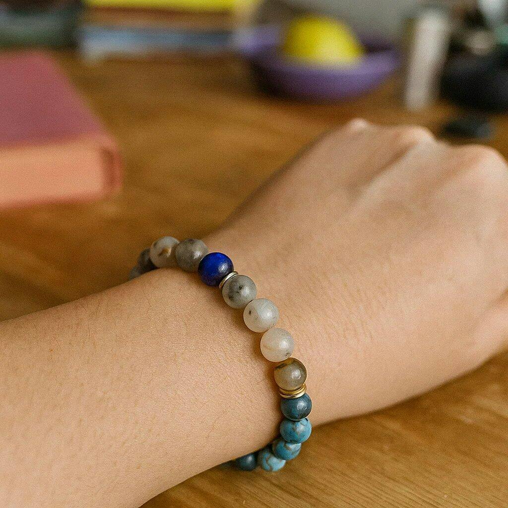 Designed for communicative, quick-minded Gemini, this bracelet encourages clear expression, focus and balanced nerves. The calming cool tones steady overthinking while supporting confident conversations—ideal for meetings, interviews and study.