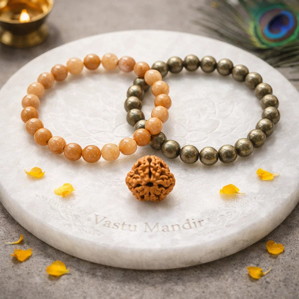 3 Mukhi Rudraksha: Supreme Agni seed - connects directly to Fire God for unmatched willpower and past karma destruction. Sunstone: Solar plexus awakens leadership crystal bringing glory, fame, removes father-related Vastu blocks. Pyrite Bracelet: Fool's Gold summons business opportunities, protects sacred Mulank 1 ambition from money losses.