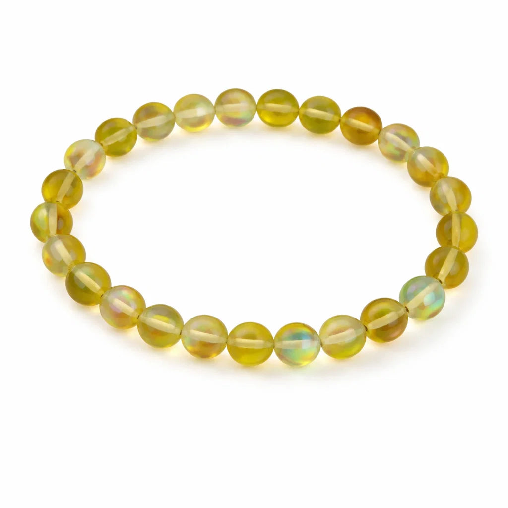 Material: 100% Natural Quartz (aura-treated, yellow/golden opalescent finish)Bead Size: 8 mm (approx.)Finish: Smooth, high-polish with warm iridescent glowStringing: Durable elastic cord, hidden/seamless knot