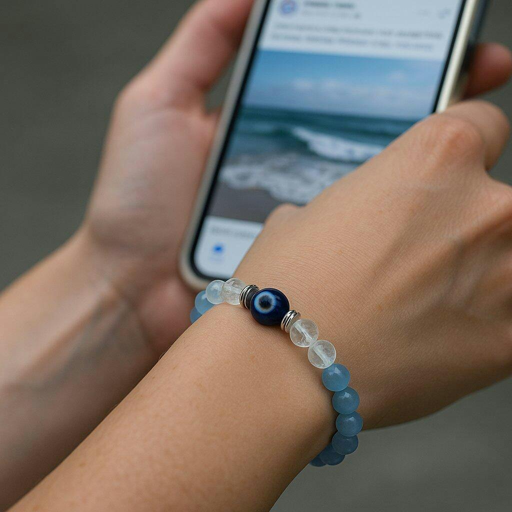 • Material: Natural Clear Quartz (Amplifier), Blue Lace Agate (Calm Communication), and a central Evil Eye Protection bead.