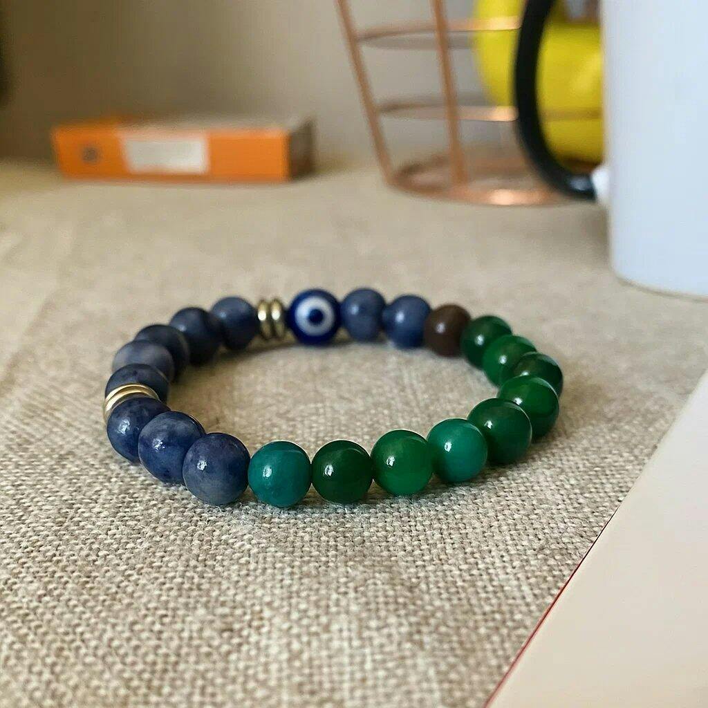 • Material: Natural Sodalite (Intuition/Truth), Chrysocolla/Apatite (Calm/Emotional Healing), and a central Evil Eye Protection bead.