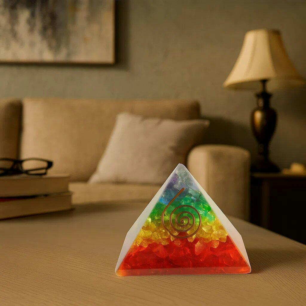 • Principle: This pyramid takes the holistic balancing of the 7 Chakra stones and adds a crucial element: the Copper Coil (Spiral). In energy work and Vastu, the spiral/coil is an active geometric shape that functions as a highly efficient antenna, continuously drawing in and channeling universal energy toward the apex. This feature makes it exceptionally powerful for intent setting and meditation, allowing the user's specific desires (e.g., clarity, healing, focus) to be amplified and radiated into the universe. It corrects the North-East Zone by refining the spiritual energy of the space, ensuring that all actions taken are rooted in clear thought and higher wisdom.