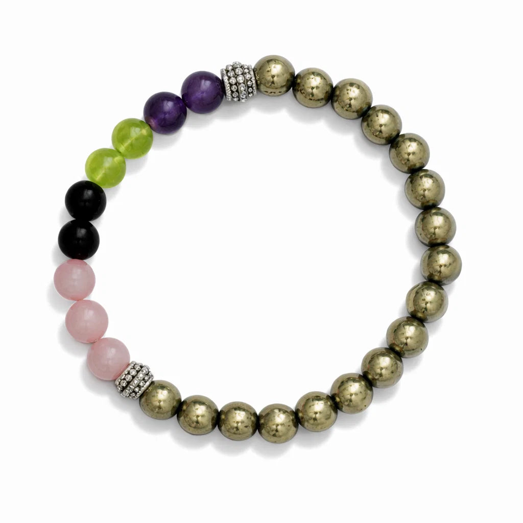 • Material: Natural Rose Quartz, Amethyst, and Pyrite (for vitality/circulation) mixed with accent spacers.